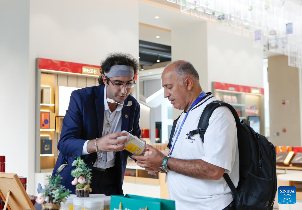 A guest to the 2025 Global South Media and Think Tank Forum visits Yunnan Baiyao Museum in Kunming, southwest China's Yunnan Province, Sept. 7, 2025. The 2025 Global South Media and Think Tank Forum opened Saturday in Kunming, capital of Yunnan. Guests toured different places in Yunnan on Sunday. (Xinhua/Chen Wei)