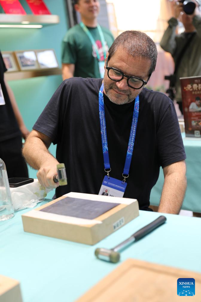A guest to the 2025 Global South Media and Think Tank Forum learns cultural heritage technique at Guandu ancient town in Kunming, southwest China's Yunnan Province, Sept. 7, 2025. The 2025 Global South Media and Think Tank Forum opened Saturday in Kunming, capital of Yunnan. Guests toured different places in Yunnan on Sunday. (Xinhua/Wang Anhaowei)