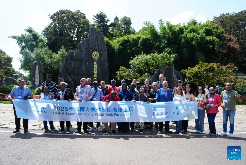 Guests to the 2025 Global South Media and Think Tank Forum pose for photo at Stone Forest scenic spot in Kunming, southwest China's Yunnan Province, Sept. 7, 2025. The 2025 Global South Media and Think Tank Forum opened Saturday in Kunming, capital of Yunnan. Guests toured different places in Yunnan on Sunday. (Xinhua/Chen Xinbo)