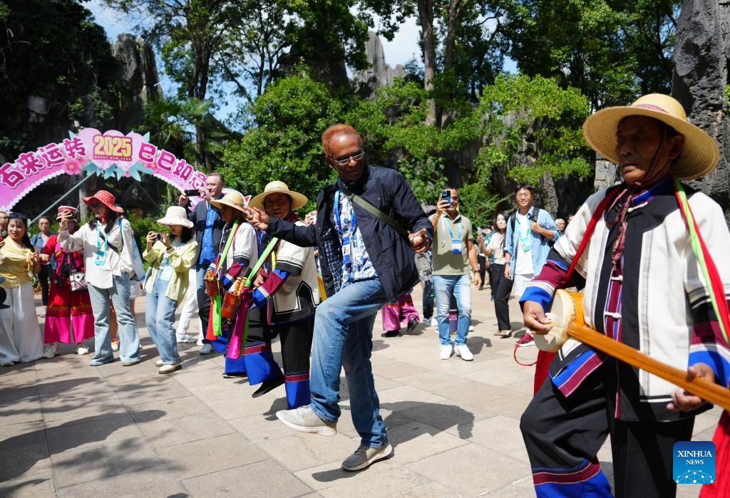 A guest to the 2025 Global South Media and Think Tank Forum dances with performers at Stone Forest scenic spot in Kunming, southwest China's Yunnan Province, Sept. 7, 2025. The 2025 Global South Media and Think Tank Forum opened Saturday in Kunming, capital of Yunnan. Guests toured different places in Yunnan on Sunday. (Xinhua/Chen Xinbo)