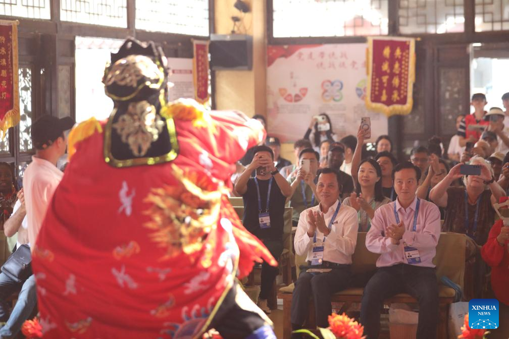 Guests to the 2025 Global South Media and Think Tank Forum watch Yunnan Opera at Guandu ancient town in Kunming, southwest China's Yunnan Province, Sept. 7, 2025. The 2025 Global South Media and Think Tank Forum opened Saturday in Kunming, capital of Yunnan. Guests toured different places in Yunnan on Sunday. (Xinhua/Wang Anhaowei)