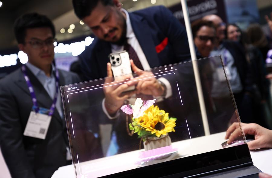 Visitors learn about the Lenovo ThinkBook transparent display laptop concept during the Mobile World Congress (MWC) 2024 in Barcelona, Spain, Feb. 28, 2024. (Xinhua/Gao Jing)