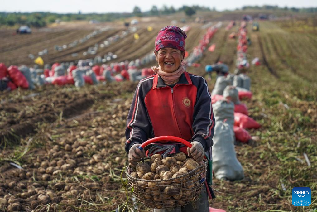 A farmer displays newly-harvested potatoes in Weichang Man and Mongolian Autonomous County of Chengde City, north China's Hebei Province, Sept. 22, 2025. (Photo by Liu Mancang/Xinhua)