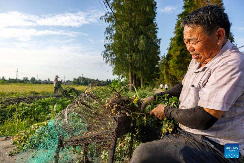 A farmer harvests peanuts at an agricultural industry park in Hailing District of Taizhou City in east China's Jiangsu Province, Sept. 22, 2025. (Photo by Tang Dehong/Xinhua)