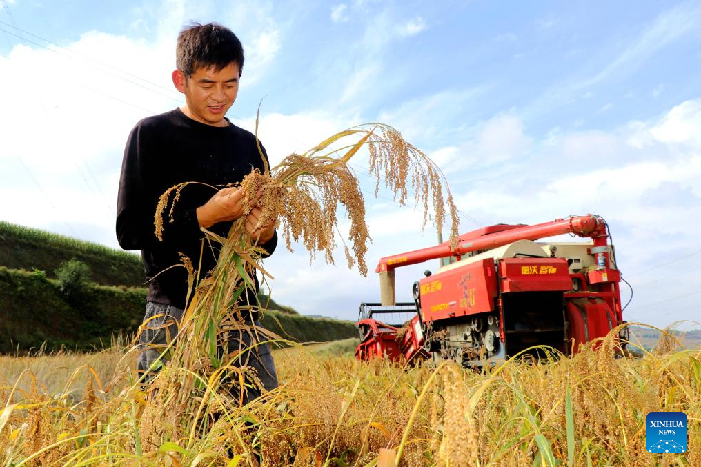 A farmer checks the condition of crops in Jutou Village of Chengchuan Town in Jingning County, Pingliang City of northwest China's Gansu Province, Sept. 22, 2025. (Photo by Wang Yi/Xinhua)