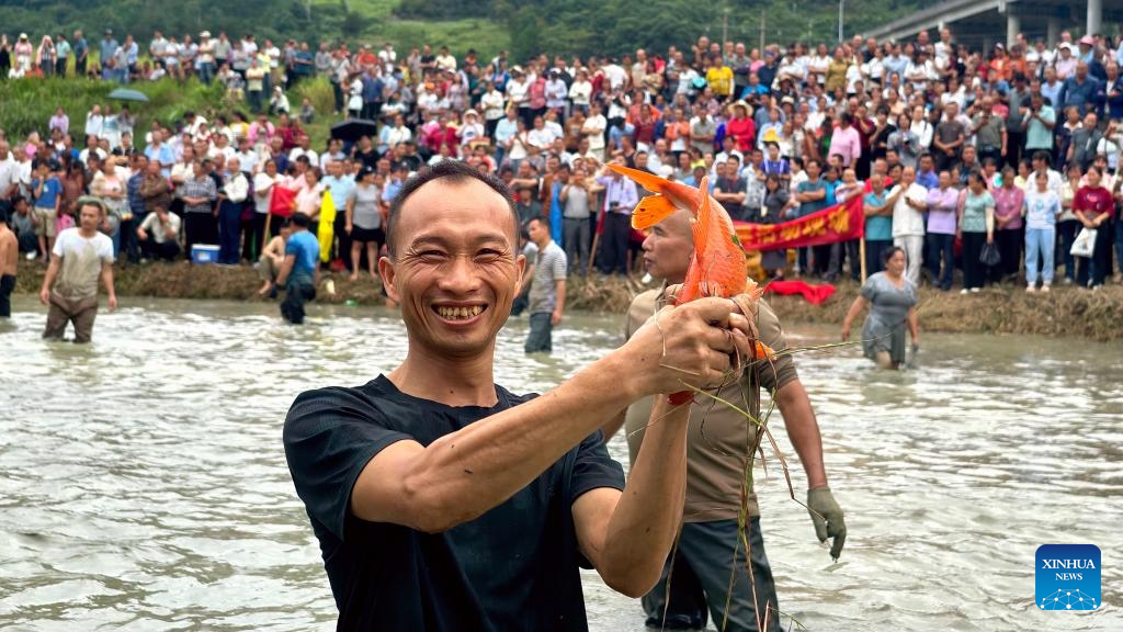 A farmer displays a newly-caught koi fish at a harvest festival event in Baping Village of Mangchang Town in Nandan County, south China's Guangxi Zhuang Autonomous Region, Sept. 22, 2025. (Photo by Gao Dongfeng/Xinhua)