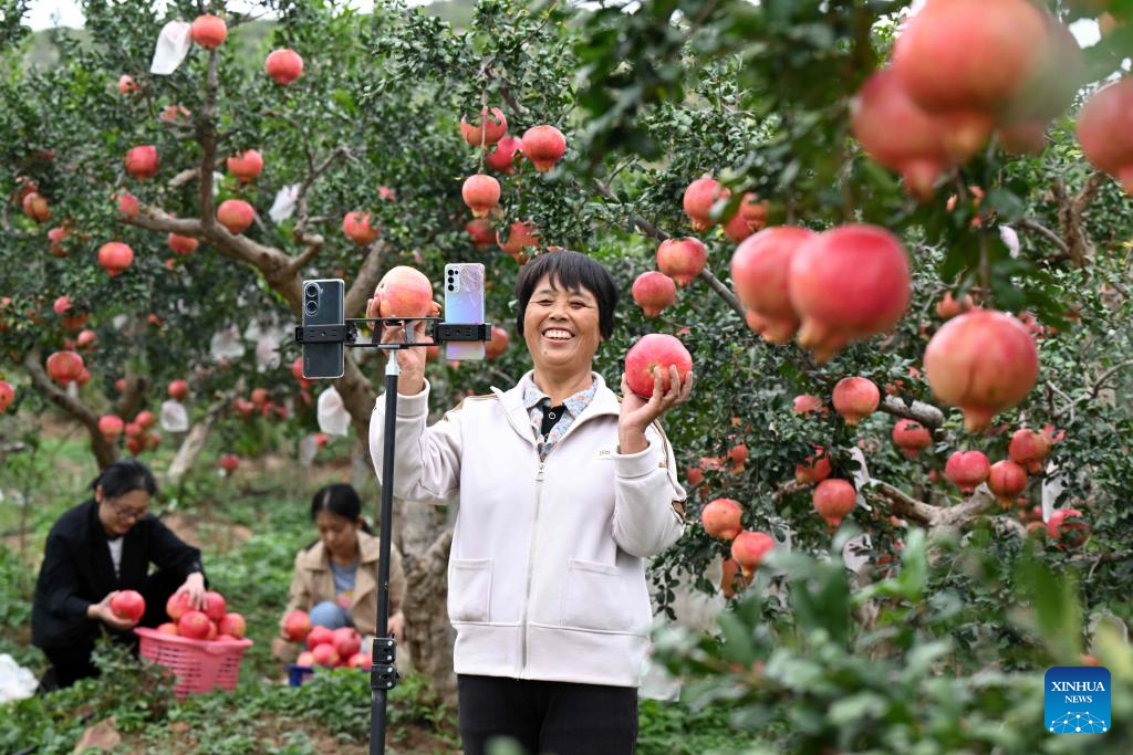 A farmer promotes fruits via live-streaming at a pomegranate orchard in Beizheng Village of Yuanshi County in Shijiazhuang City, north China's Hebei Province, Sept. 22, 2025. (Photo by Chen Qibao/Xinhua)