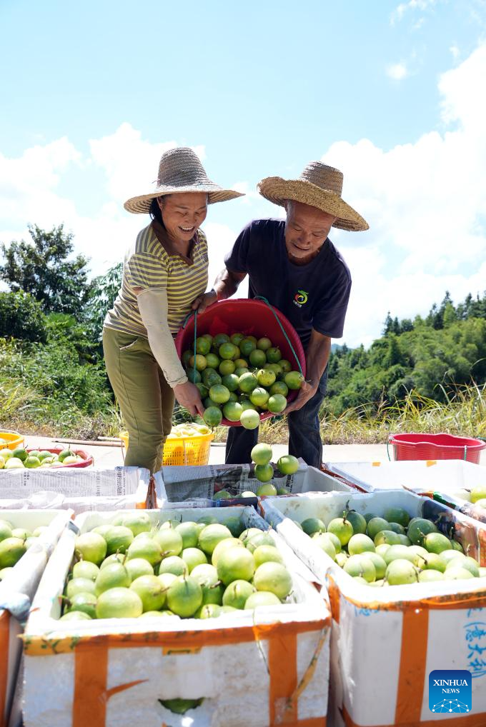 A farmer harvests pomelos at a pomelo orchard in Pinghe County, southeast China's Fujian Province, Sept. 22, 2025. (Photo by Li Runnan/Xinhua)
