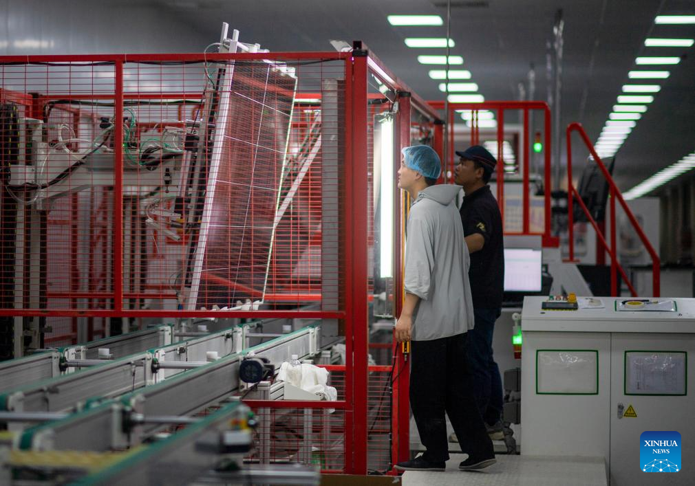 Staff members work on the production line of photovoltaic panels at the workshop of a new energy company in Ruoqiang County, Mongolian Autonomous Prefecture of Bayingolin, northwest China's Xinjiang Uygur Autonomous Region, Sept. 22, 2025. Xinjiang, a region rich in solar and wind energy resources, has vigorously developed the new energy industry in recent years, accelerating the construction of large-scale wind and photovoltaic power base projects.