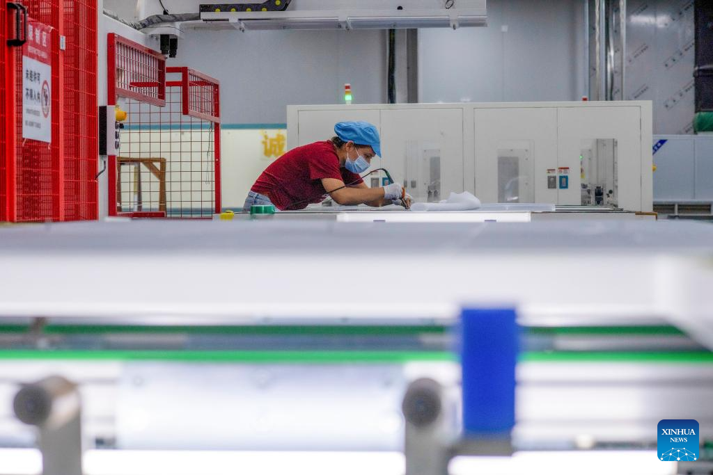 A staff member works at the workshop of a new energy company in Ruoqiang County, Mongolian Autonomous Prefecture of Bayingolin, northwest China's Xinjiang Uygur Autonomous Region, Sept. 22, 2025. Xinjiang, a region rich in solar and wind energy resources, has vigorously developed the new energy industry in recent years, accelerating the construction of large-scale wind and photovoltaic power base projects.