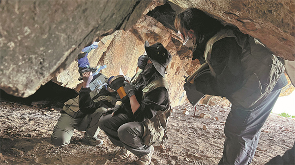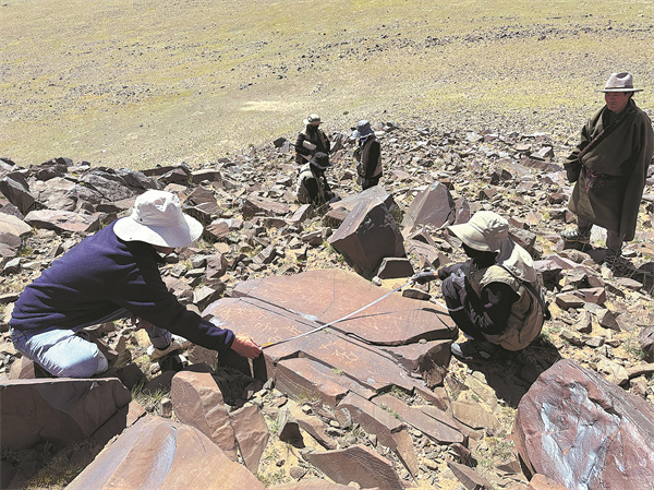 The Changthang Women's Survey Team inspects an unusual motif in Nyima county of Nagchu city, Xizang autonomous region, in July 2024. [Photo provided to China Daily]