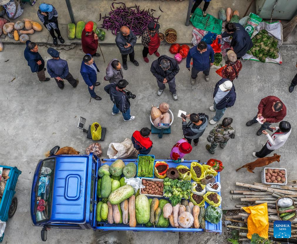 A staff member from a catering enterprise (1st R) purchases agricultural products from elderly villagers in Guantian Village of Chun'an County in Hangzhou City, east China's Zhejiang Province, Oct. 27, 2025. A series of celebration activities were held across the country to mark China's Chongyang Festival, which will fall on Oct. 29 this year. Also known as Seniors' Day in China nowadays, it highlights the public's care for older people. (Xinhua/Xu Yu)