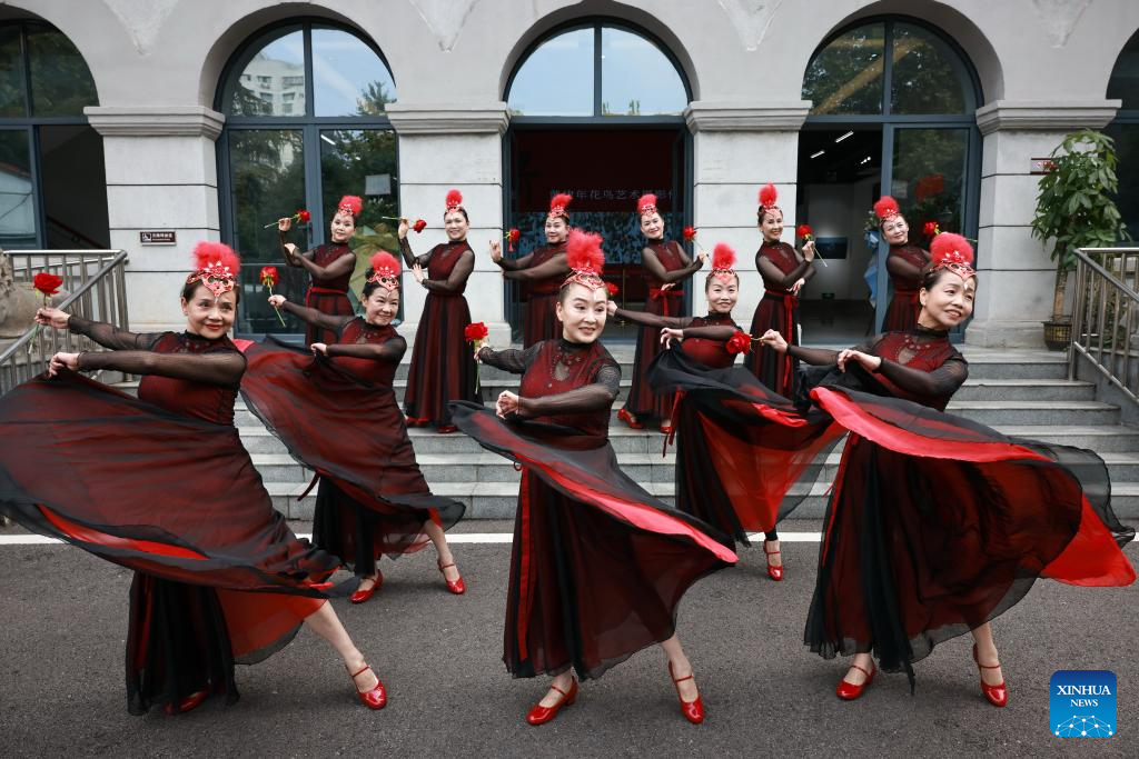 Senior citizens perform folk dance at an art center in Wuhan, central China's Hubei Province, Oct. 27, 2025. A series of celebration activities were held across the country to mark China's Chongyang Festival, which will fall on Oct. 29 this year. Also known as Seniors' Day in China nowadays, it highlights the public's care for older people. (Photo by Zhao Jun/Xinhua)