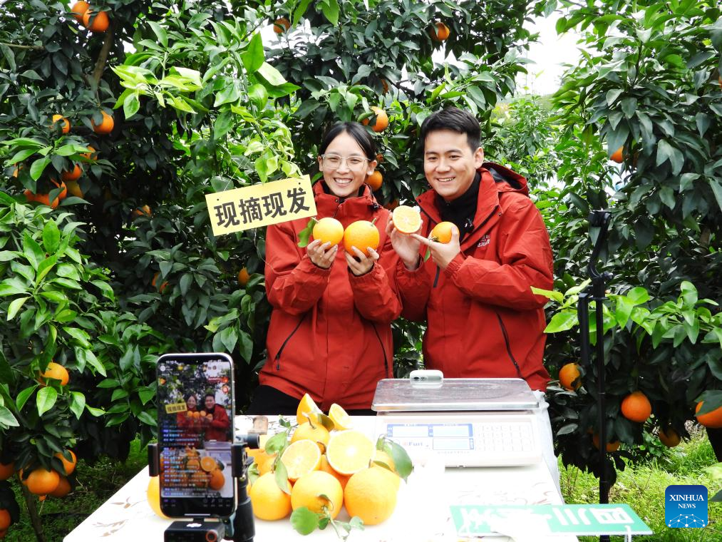 Staff members sell navel oranges via live-streaming at a planting base in Quxian County of Dazhou, southwest China's Sichuan Province, Nov. 18, 2025. (Photo by Deng Liangkui/Xinhua)