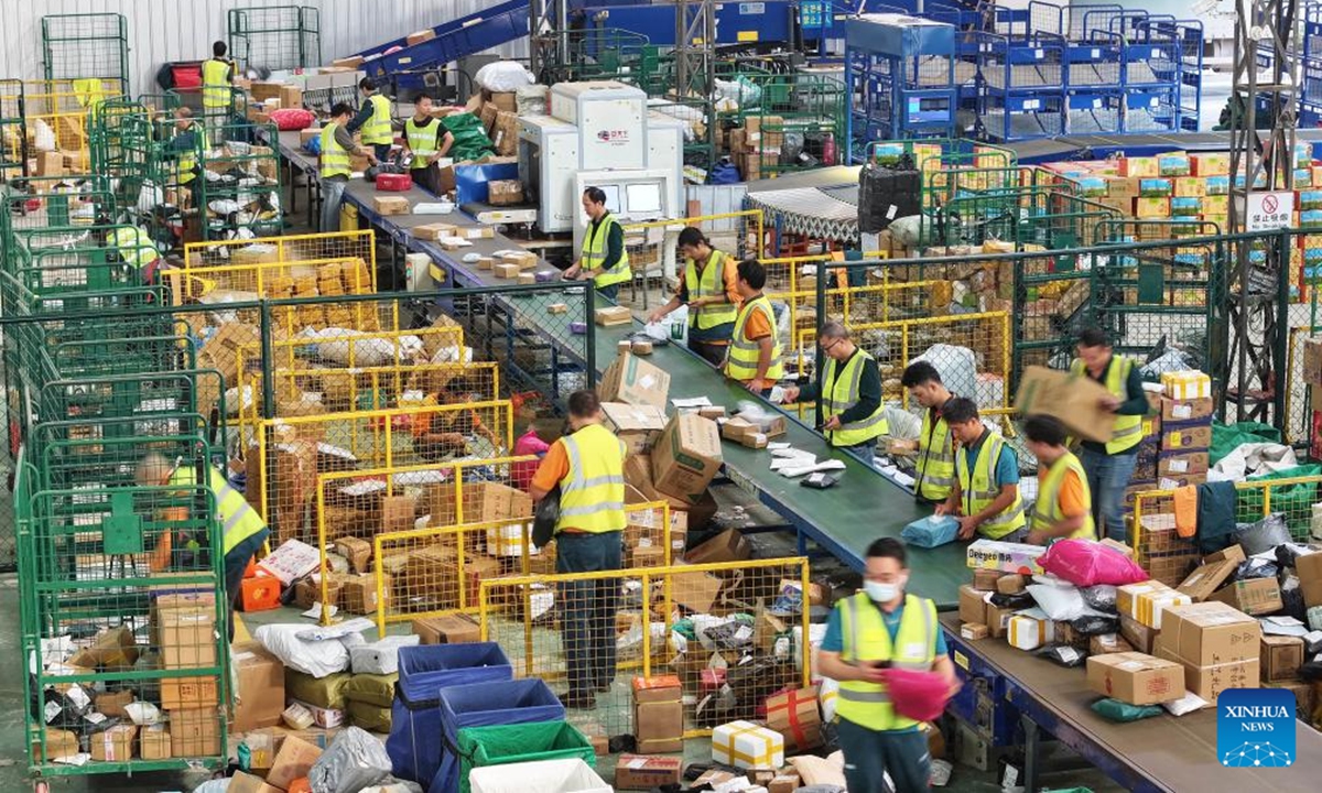 Staff members sort packages at a logistic center of Zaozhuang branch of China Post in Zaozhuang City, east China's Shandong Province, Nov. 11, 2024. (Photo: Xinhua)