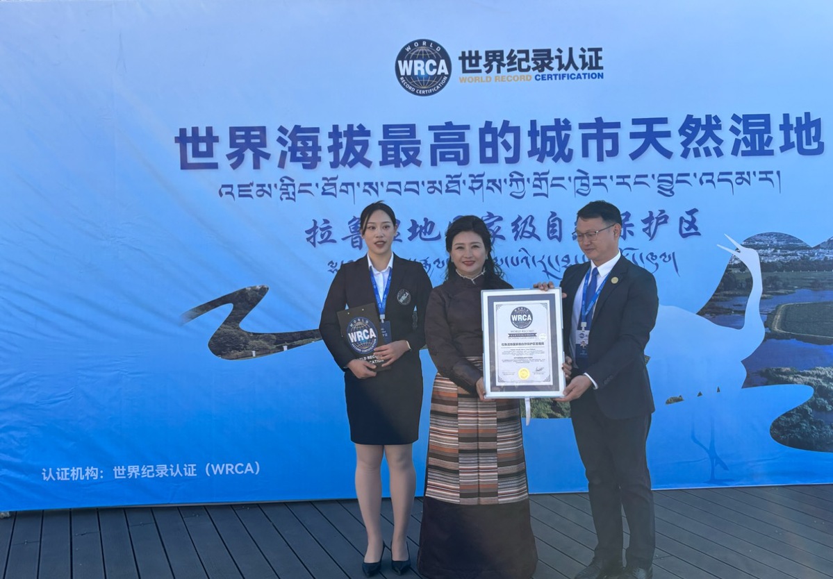 The Lhalu Wetland National Nature Reserve in Lhasa, Xizang autonomous region, has officially been recognized by the World Record Certification Agency (WRCA) as the world's highest-altitude urban natural wetland, authorities announced on Saturday in Lhasa.
