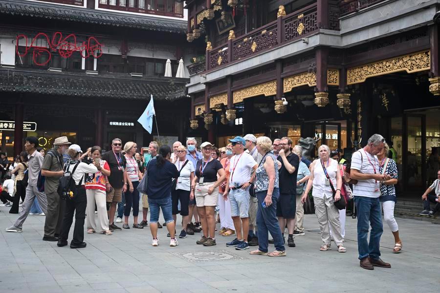 A tour group from Britain is pictured at Yuyuan Garden Mall in east China's Shanghai, Oct. 3, 2025. (Xinhua/Chen Haoming)