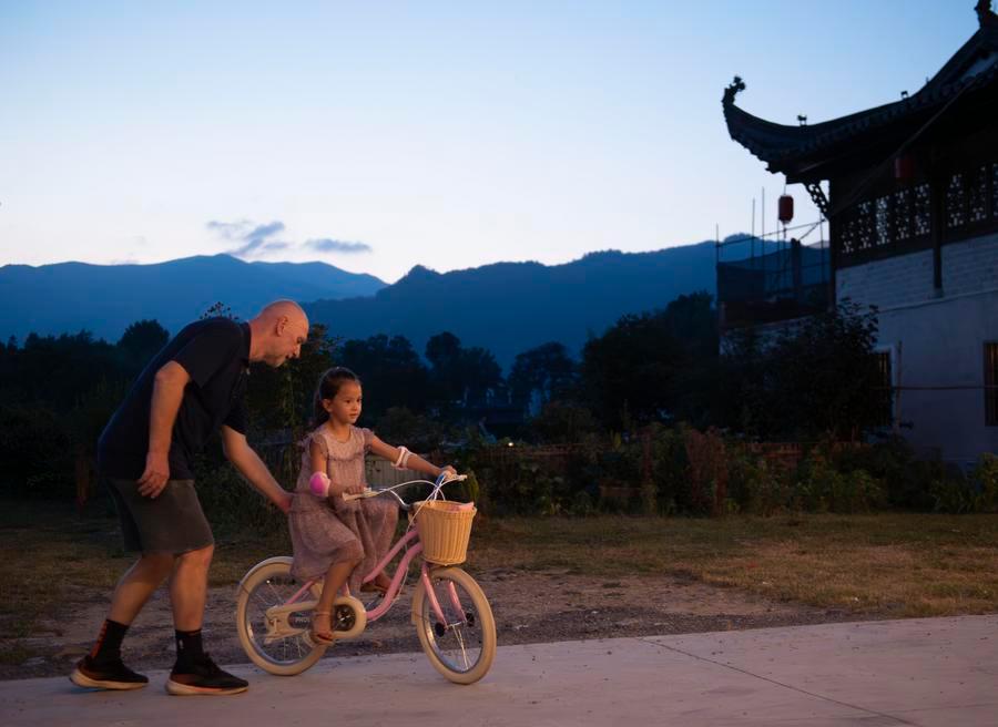 Armin Schober (L) teaches his daughter Alina to ride a bicycle in Yixian County, Huangshan City, east China's Anhui Province, July 31, 2024. (Xinhua/Fu Tian)