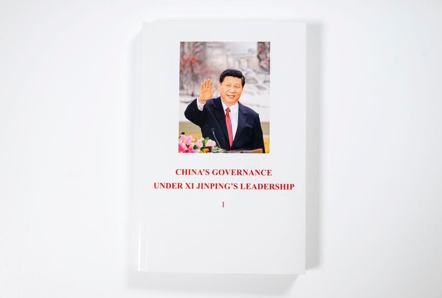 This photo shows a book of the English edition of the first volume of "China's Governance Under Xi Jinping's Leadership." (Xinhua/Cai Yang)