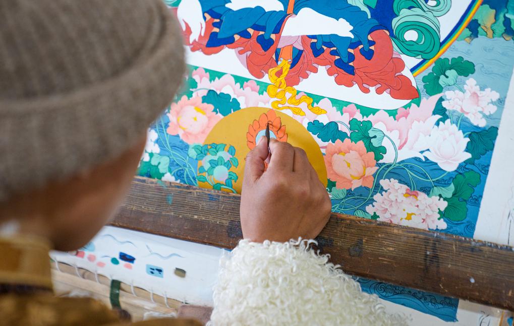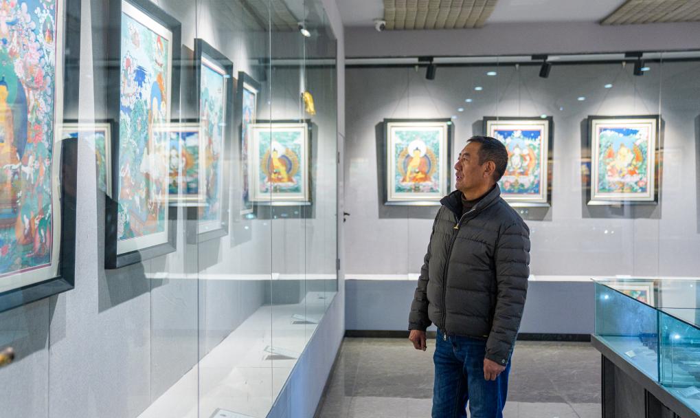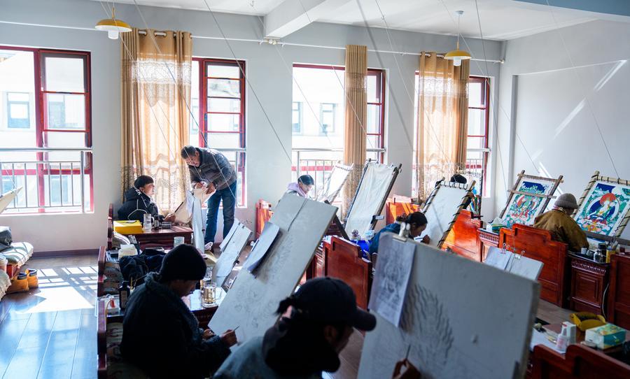 LHASA, March 1 (Xinhua) -- On the afternoon of Feb. 10, sunlight streamed through the windows of the Xizang Academy of Thangka, illuminating an unfinished thangka painting. Norbu Sidar stood beside a young apprentice. He reached out, gently placing his finger on a specific spot on the canvas, and quietly guided the apprentice on the direction of the lines.