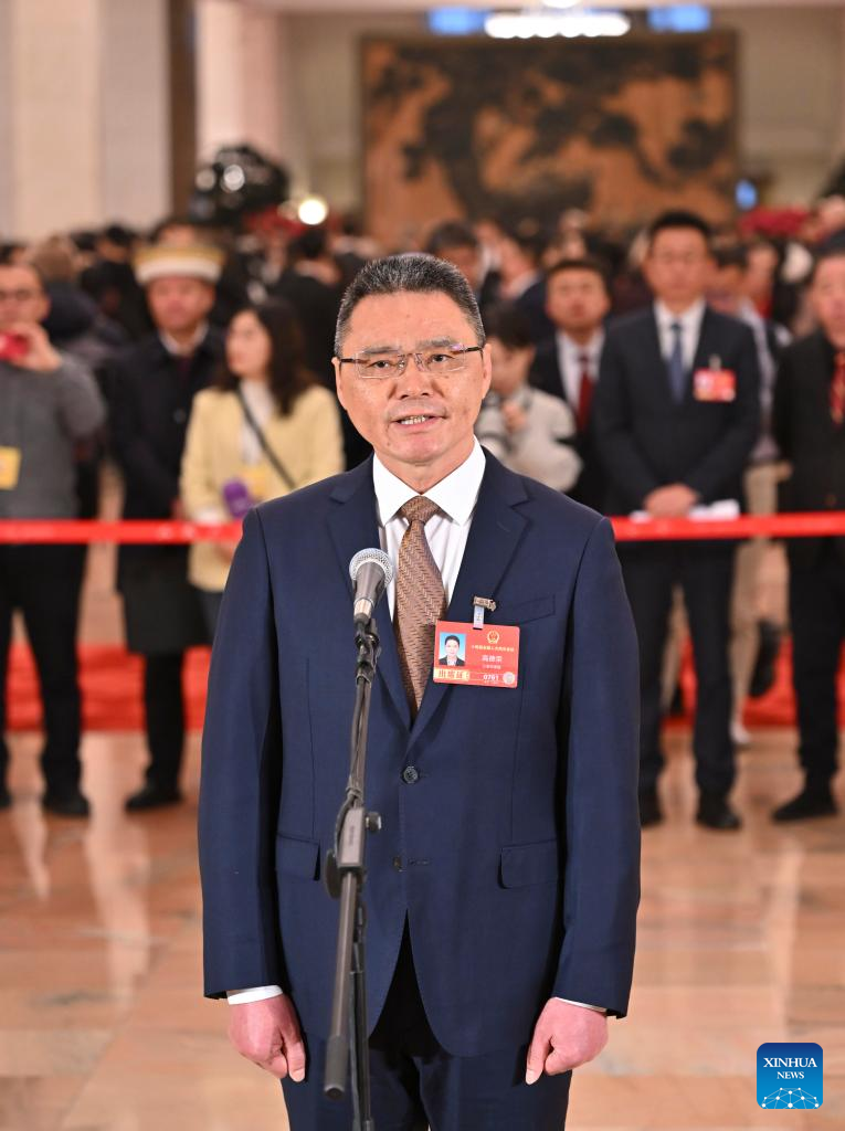 Gao Derong, a deputy to the 14th National People's Congress (NPC), attends a group interview ahead of the opening meeting of the fourth session of the 14th NPC at the Great Hall of the People in Beijing, capital of China, March 5, 2026. (Xinhua/Li Xin)