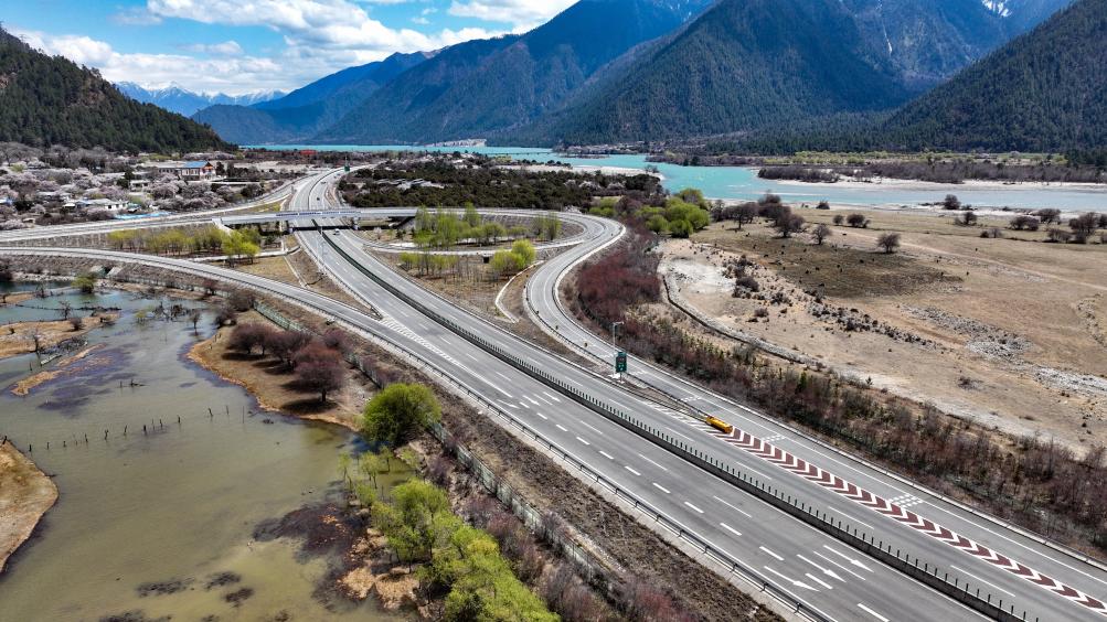 This aerial drone photo taken on April 1, 2025 shows the high-grade highway from Lhasa to Nyingchi in Southwest China's Xizang autonomous region.