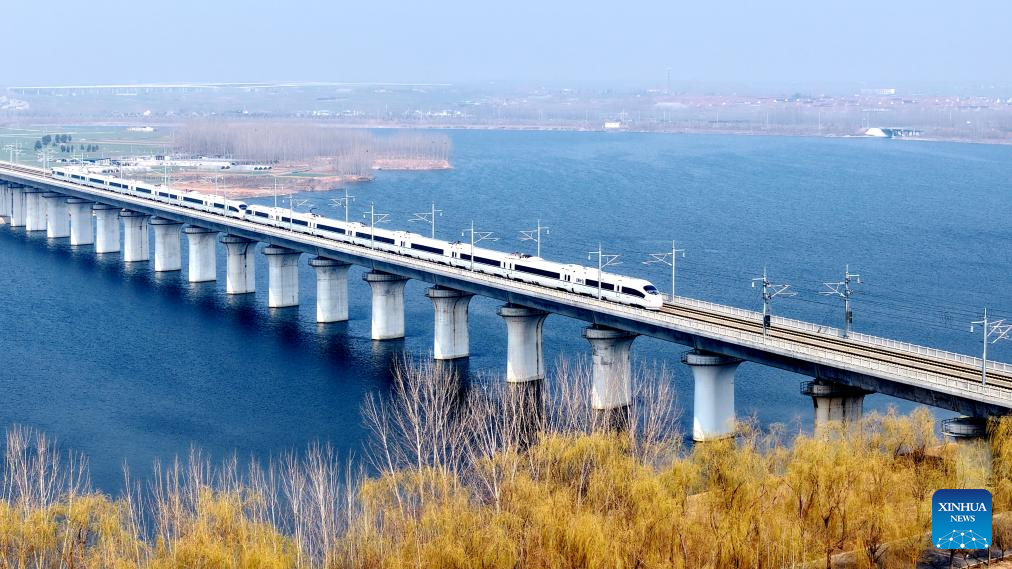 A drone photo taken on March 13, 2026 shows two bullet trains running on a railway bridge in north China's Tianjin. The 2026 Spring Festival travel rush comes to an end on Friday. (Photo by Du Penghui/Xinhua)