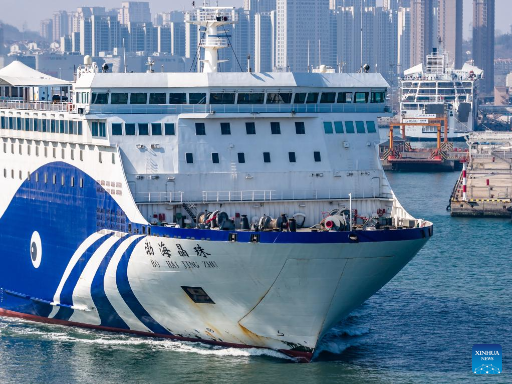 A drone photo taken on March 13, 2026 shows a ro-ro passenger ship departing Yantai Port in Yantai, east China's Shandong Province. The 2026 Spring Festival travel rush comes to an end on Friday. (Photo by Zhang Chao/Xinhua)