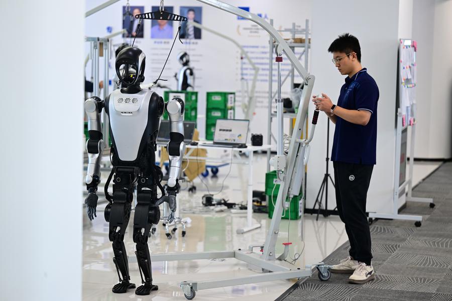 An engineer adjusts a humanoid robot at a laboratory of Leju Robotics in Hefei, east China's Anhui Province, Oct. 24, 2025. (Xinhua/Zhou Mu)