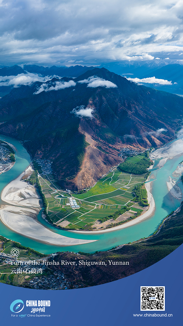 In Shigu town of Yulong Naxi autonomous county, Yunnan province, lies Shiguwan along the Jinsha River. Here, the river makes a dramatic turn, forming a striking V-shaped bend as it winds around the surrounding mountains. From afar, the river curves and loops like a flowing ribbon drifting through the valleys — powerful yet graceful, a stunning reminder of nature's artistry carved by water over time.