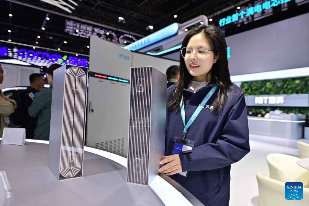 A staff member introduces a product during the 14th Energy Storage International Conference and Expo (ESIE) at the Capital International Exhibition & Convention Center in Beijing, capital of China, April 2, 2026. The 14th ESIE, featuring six themed exhibition pavilions, opens from March 31 to April 3. (Xinhua/Yin Dongxun)