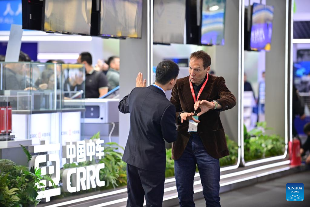 A visitor (R) learns about energy storage products of China Railway Rolling Stock Corporation (CRRC) during the 14th Energy Storage International Conference and Expo (ESIE) at the Capital International Exhibition & Convention Center in Beijing, capital of China, April 2, 2026. The 14th ESIE, featuring six themed exhibition pavilions, opens from March 31 to April 3. (Xinhua/Yin Dongxun)