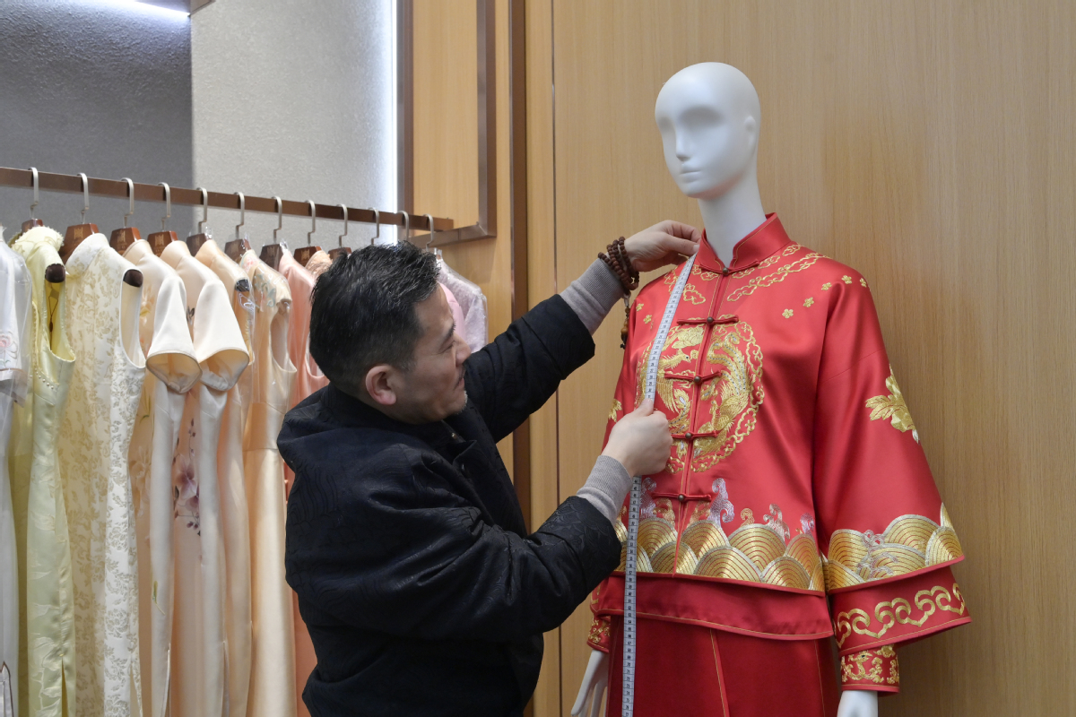 An inheritor of the Huizhou tailoring technique, an item of intangible cultural heritage in Anhui province, takes measurements at a tailor shop in Hefei, the province's capital, on Jan 20. FU MIN/CHINA NEWS SERVICE
