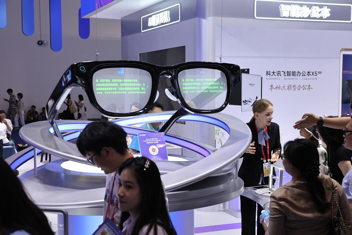 Visitors check out artificial intelligence glasses by Chinese AI enterprise iFLYTEK at the China International Consumer Products Expo in Haikou, Hainan province, on Monday. WANG JING / CHINA DAILY